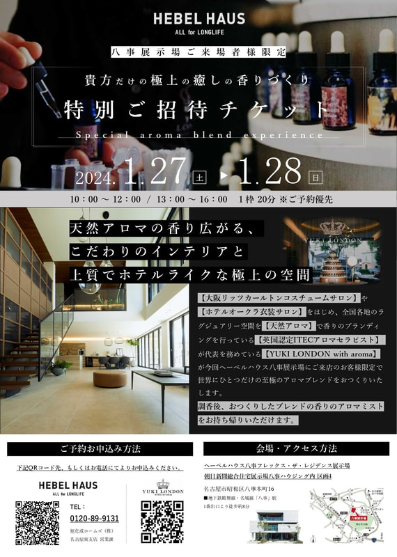 旭化成ホームズ様が開催する展示場イベントにて、ユキロンドンがお客様にオリジナルアロマをお作りします。 今回イベントの会場になるのはヘーベルハウス注文住宅 八事展示場様。 こだわりのホテルライクで上質な空間で、世界にひとつのオリジナルアロマを調香してみませんか。